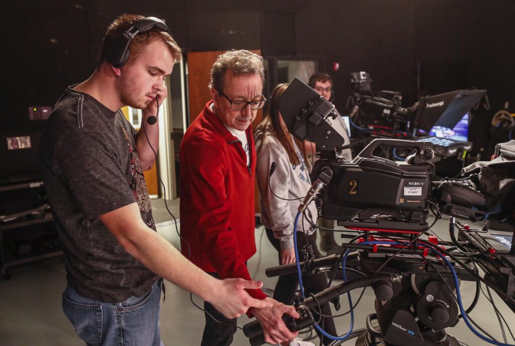 University of Northern Iowa digital production major Ethan Ahrens is shown how to run a TV broadcast camera by Associate Professor Philip Hopper as students practice in the TV news studio in Lang Hall on Wednesday.CHRIS ZOELLER Courier Staff Photographer